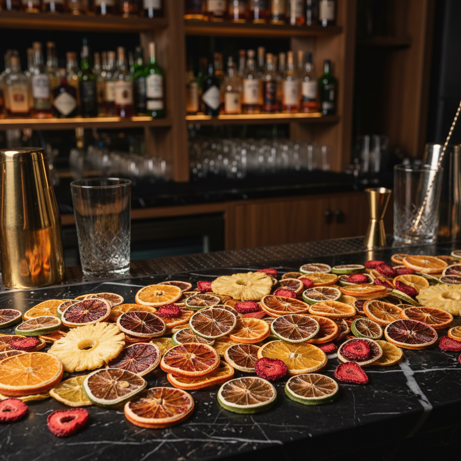 Dehydrated garnishes crafted for cocktails, teas, mocktails, & culinary artistry.